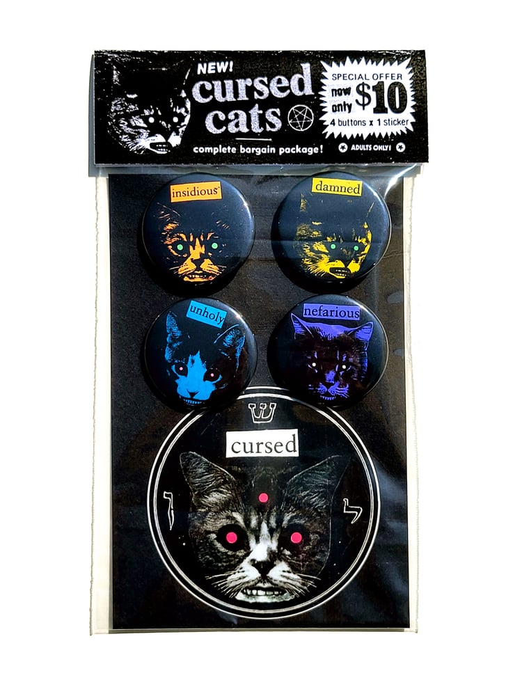 These are now available right here, in this shop! 4 Cursed Cat buttons (1.5 inch) and a Cursed Cat sticker. They are nefariously priced at $10, as the label says, and if you're in the US, shipping is an additional $4.75, and it will ship First Class USPS, tracking included.
